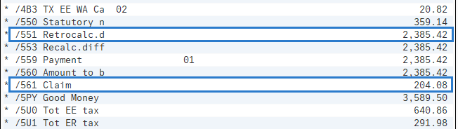 Tips:Add the amounts from/551 Difference and /561 Claim to calculate the gross overpayment. In this example, the payroll simulation identified a /551 Difference for $2,385.42 and a /561 Claim for $204.08. The gross overpayment amount for the period is $2,589.50 ($2,385.42 + $204.08).